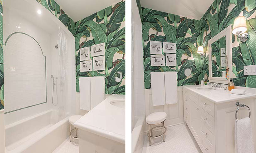 The children’s room that merges functionality with vibrant aesthetics. Key elements include a turquoise wall with a wave mural, modern furniture for storage, a warm wooden floor, and a cozy window seat for reading. The bathroom features a comfortable bathtub and serene leaf-patterned wallpaper, creating a dynamic, practical, and imaginative space for children.