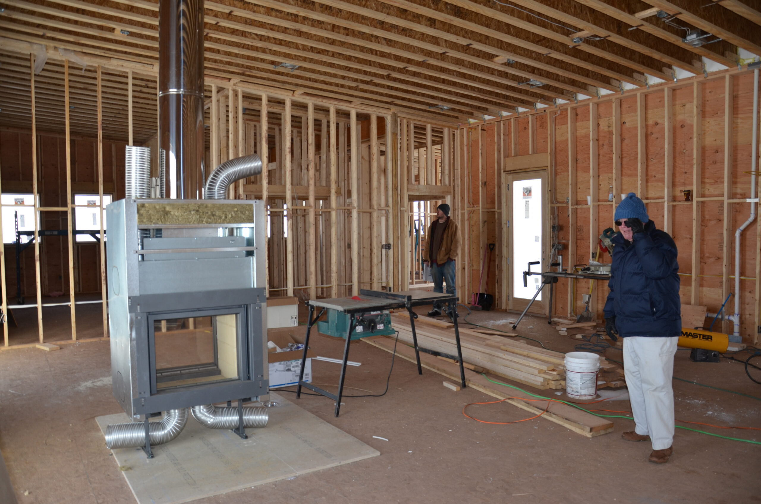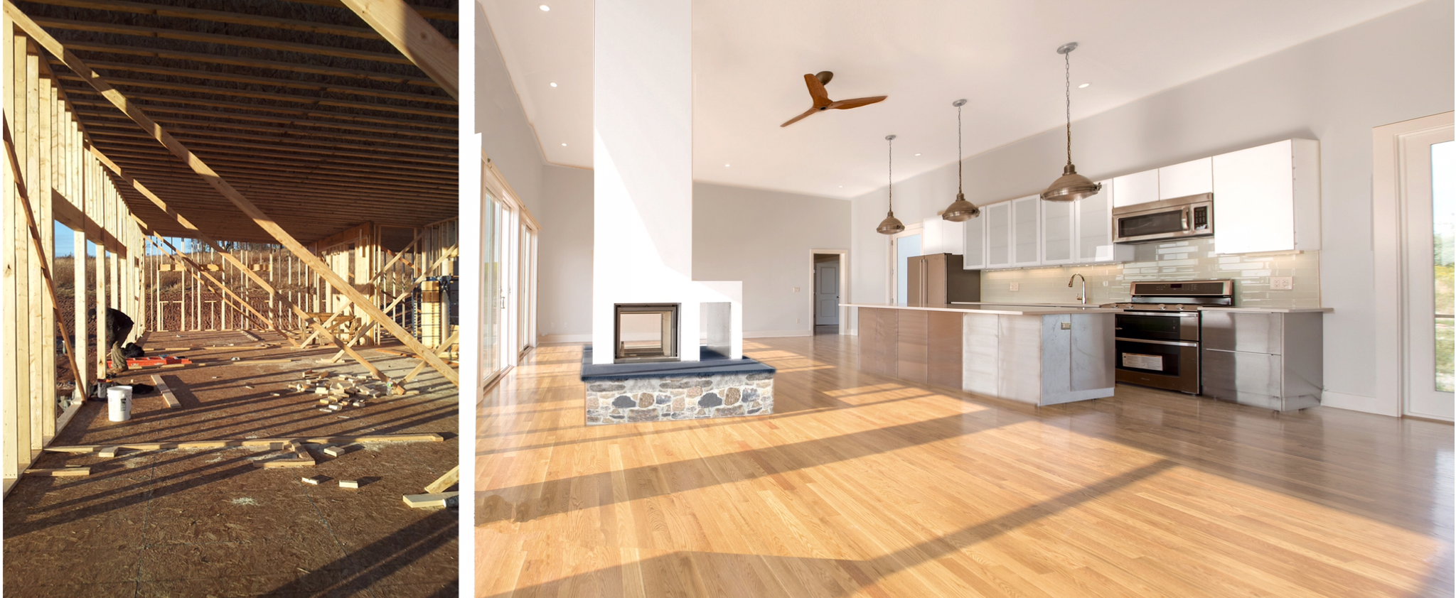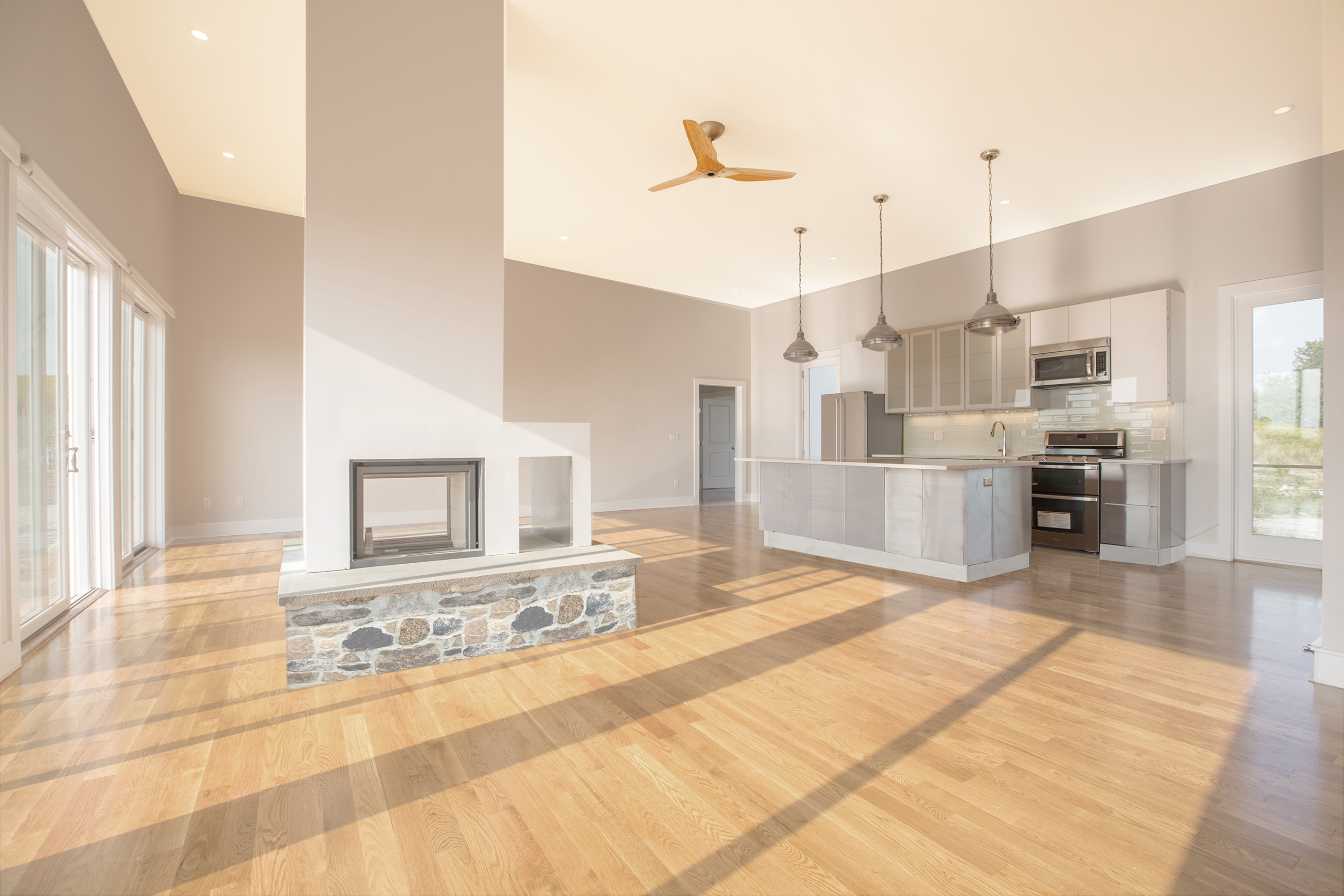 This interior space features a seamless blend of modern design and functional elegance. The open-concept layout creates a sense of flow between the living area and the kitchen, making it an inviting environment for both relaxation and entertaining. A striking stone fireplace serves as a focal point, adding warmth and character to the room. Abundant natural light pours in through large windows, enhancing the beauty of the hardwood flooring and sleek cabinetry. The neutral color palette contributes to the airy atmosphere, while contemporary pendant lights add a stylish touch. This project exemplifies how thoughtful design can create a welcoming and aesthetically pleasing living space.
