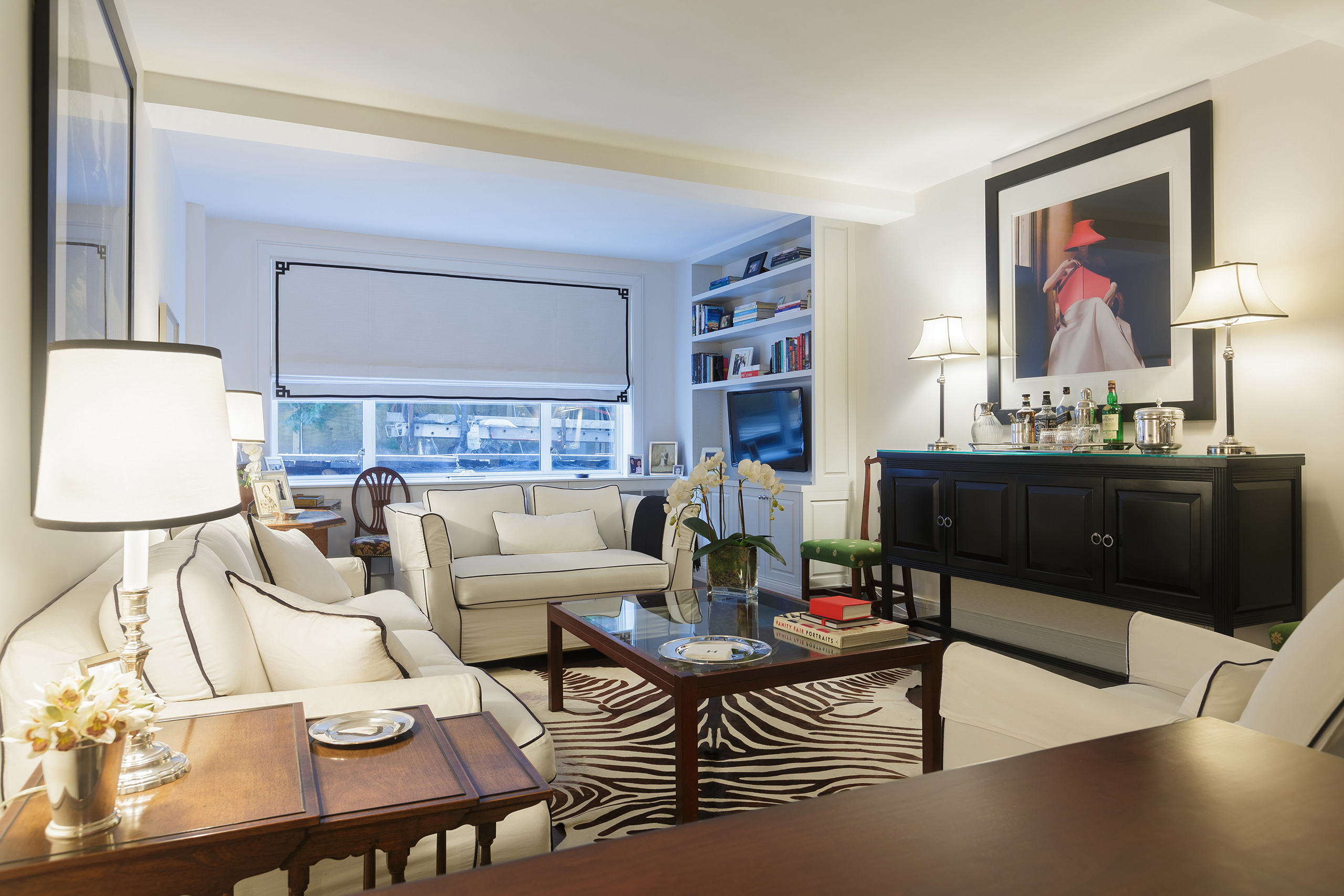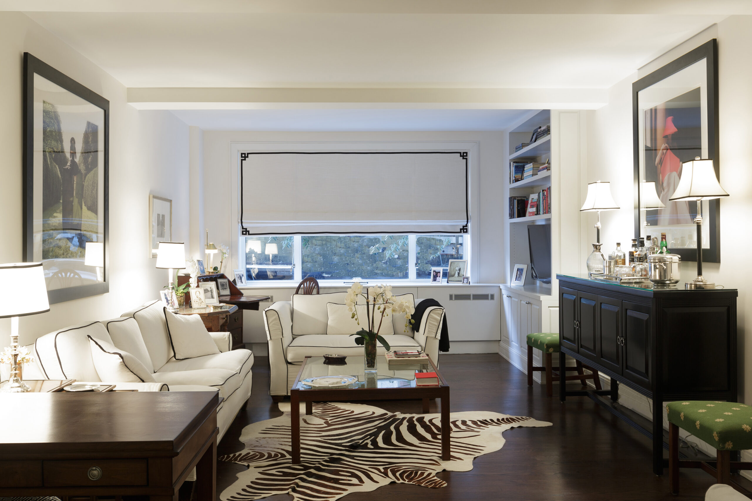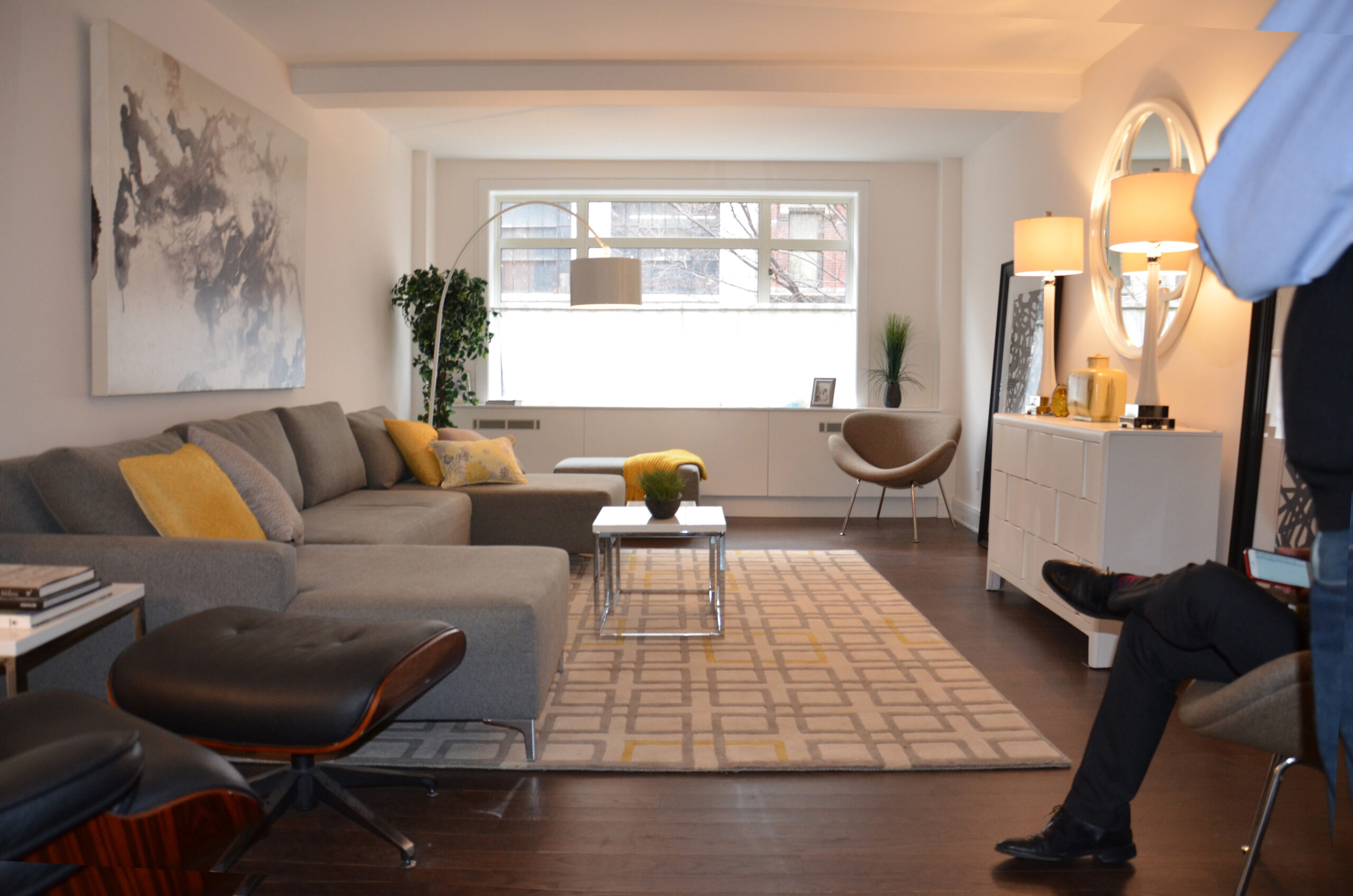 Family room design that blends comfort, functionality, and aesthetics. Key elements include a cozy sofa, large windows for natural light, a wooden floor for warmth, white walls for a spacious feel, and a stylish storage cabinet. These components create an inviting and practical space for family gatherings and relaxation.