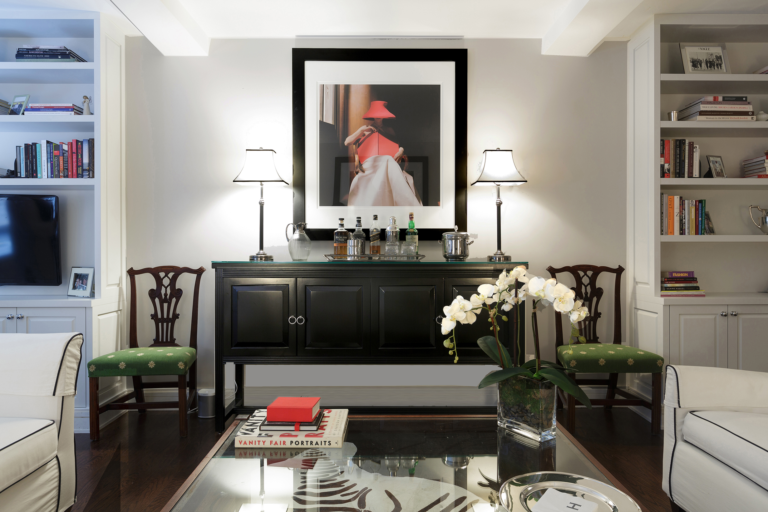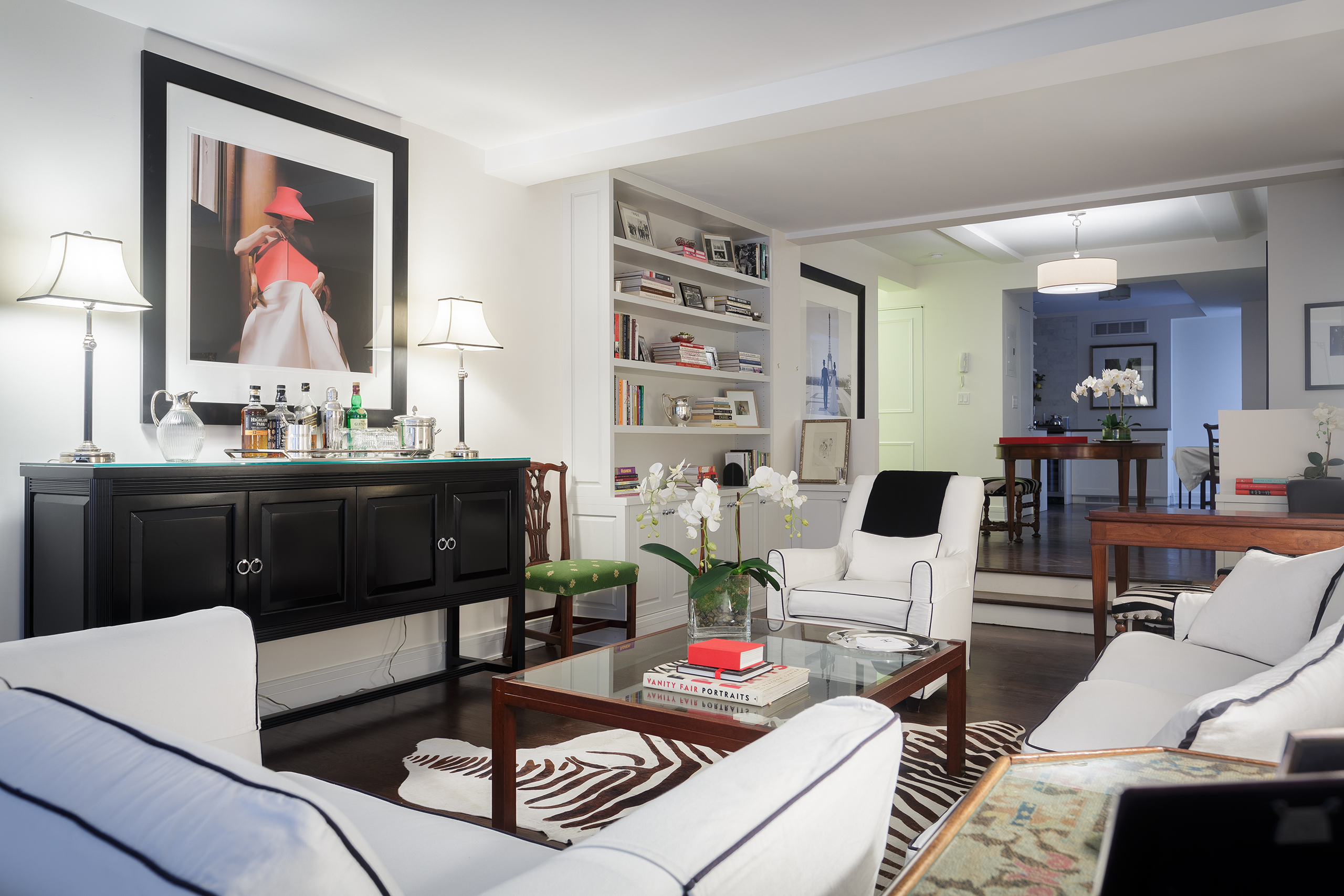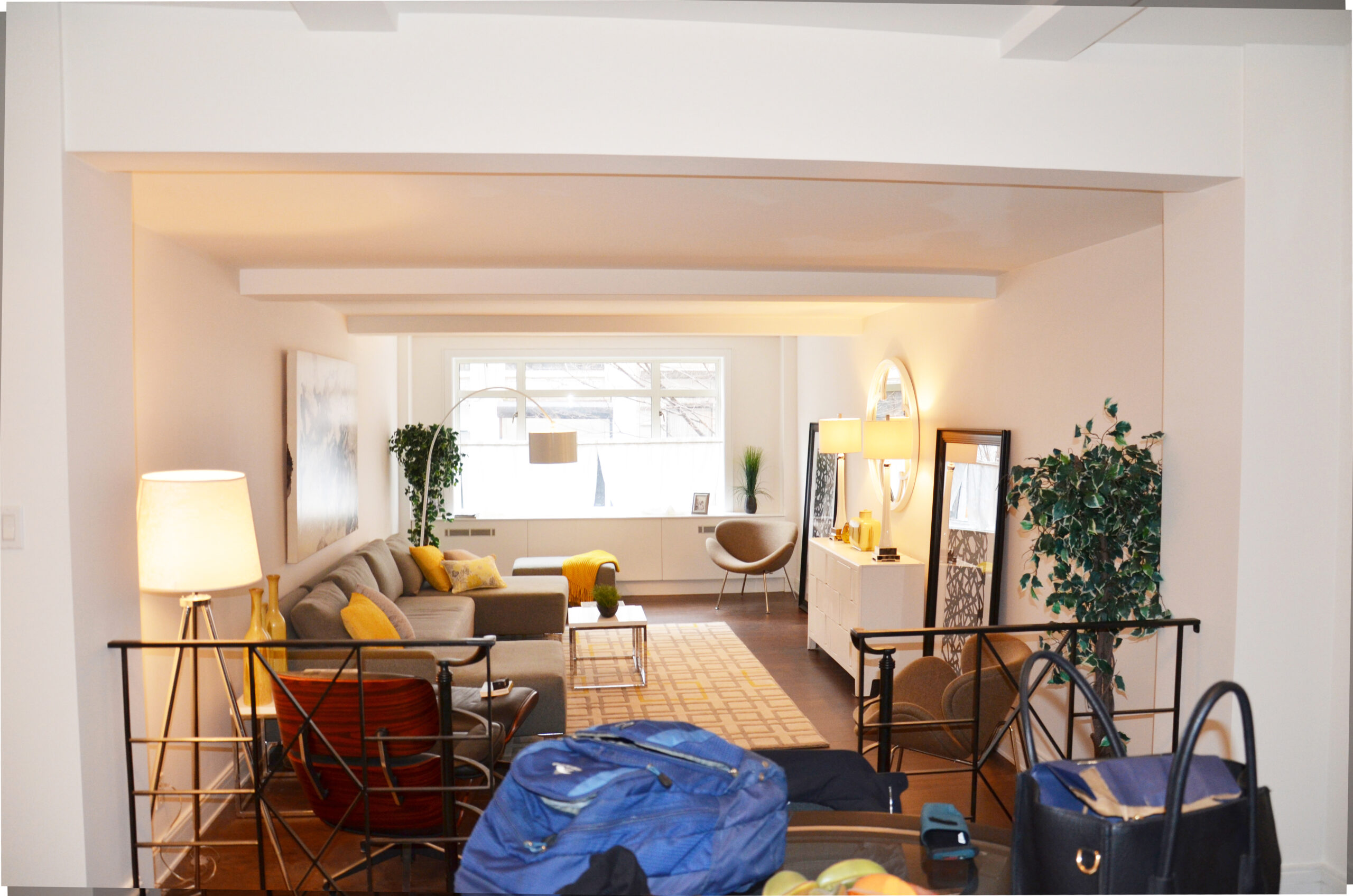 Family room design that blends comfort, functionality, and aesthetics. Key elements include a cozy sofa, large windows for natural light, a wooden floor for warmth, white walls for a spacious feel, and a stylish storage cabinet. These components create an inviting and practical space for family gatherings and relaxation.