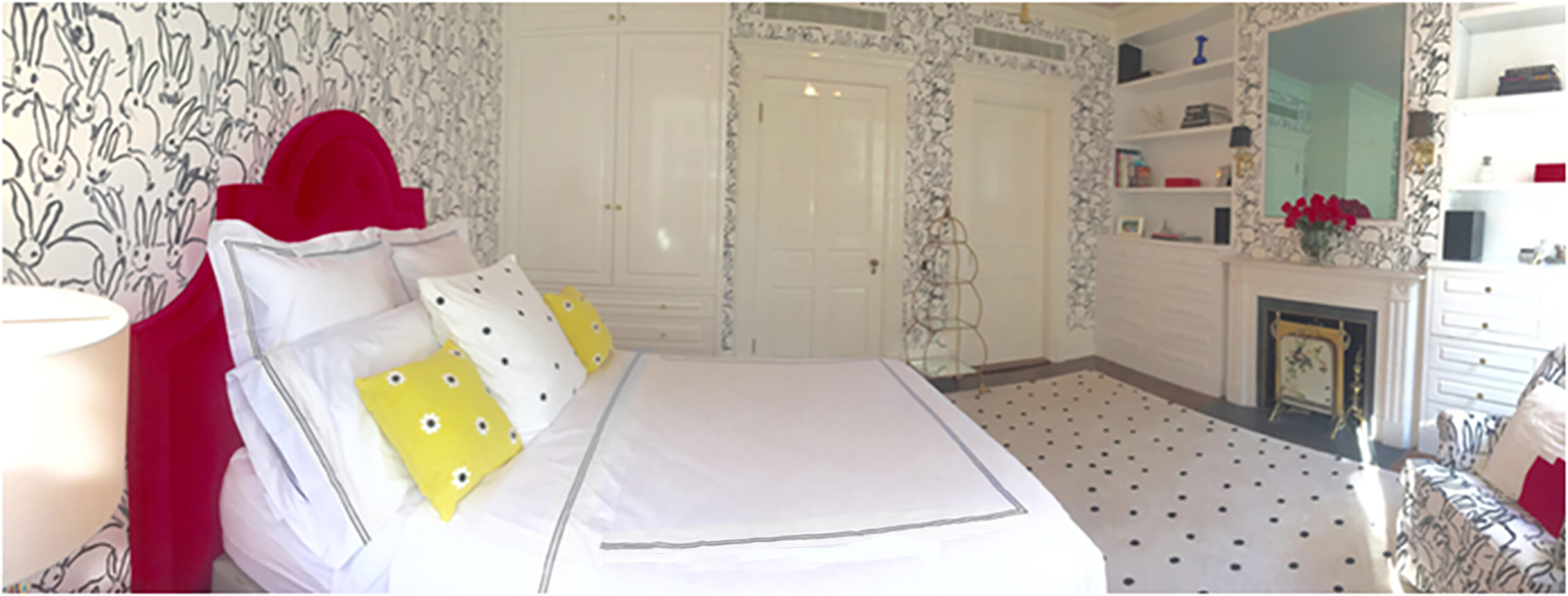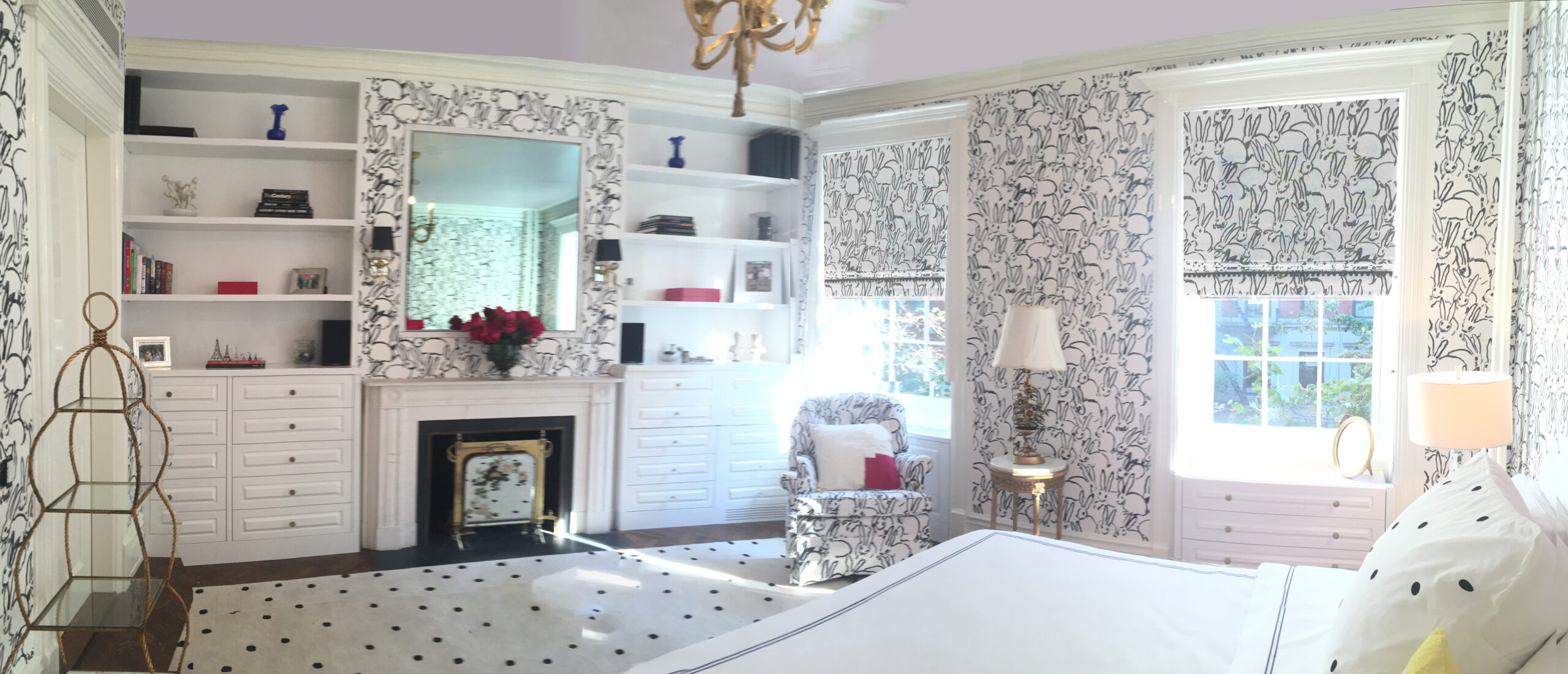 Bedroom’s interior design by harmonizing various elements for a cohesive and inviting space. Key features include a warm wooden floor paired with a playful white carpet with black dots, white-hued wallpaper for a serene backdrop, and a functional cabinet for ample storage. Additional touches like a practical bookshelf and a cozy window seat enhance both style and comfort. Together, these elements create a stylish retreat that balances functionality with aesthetics.