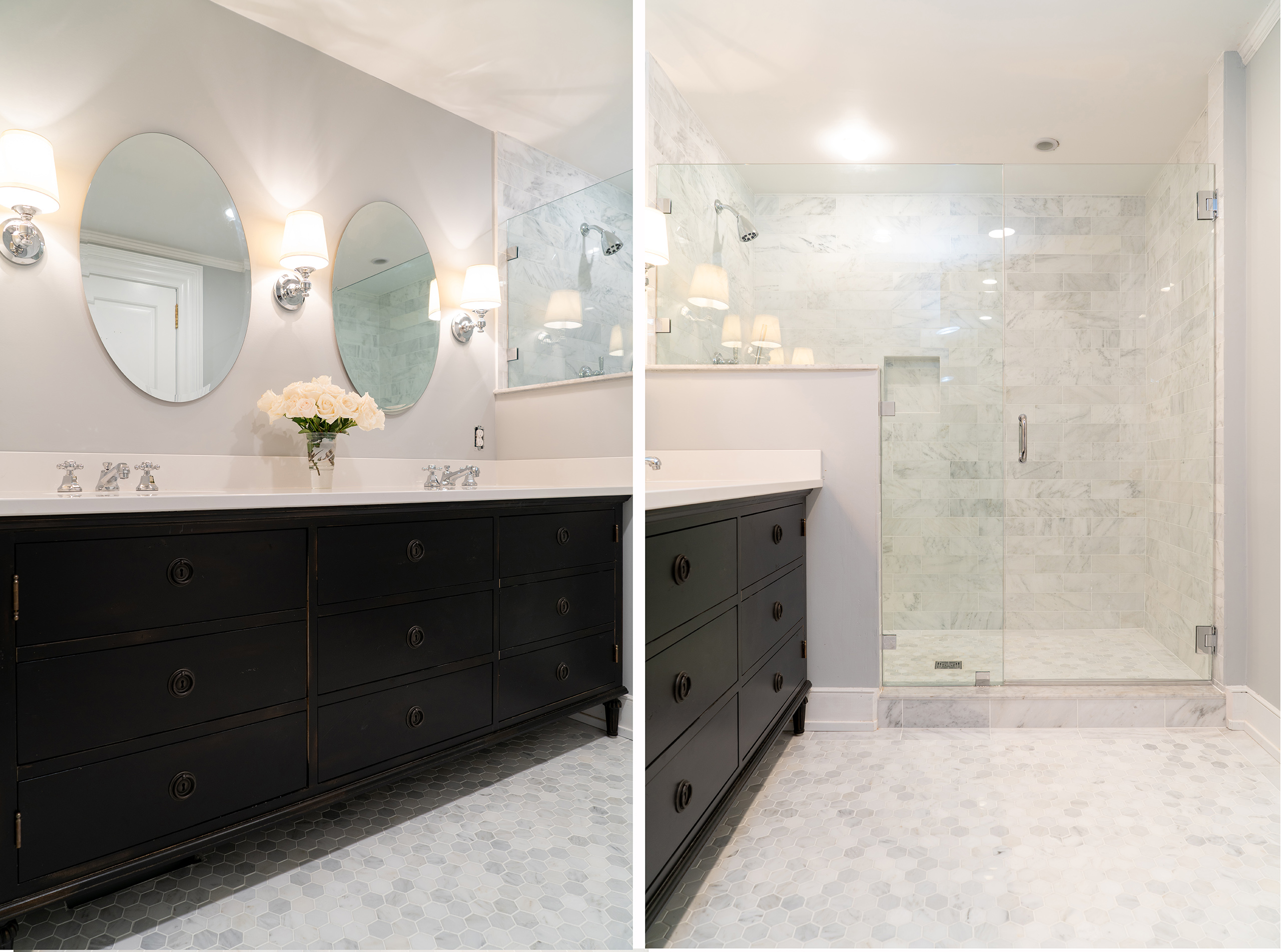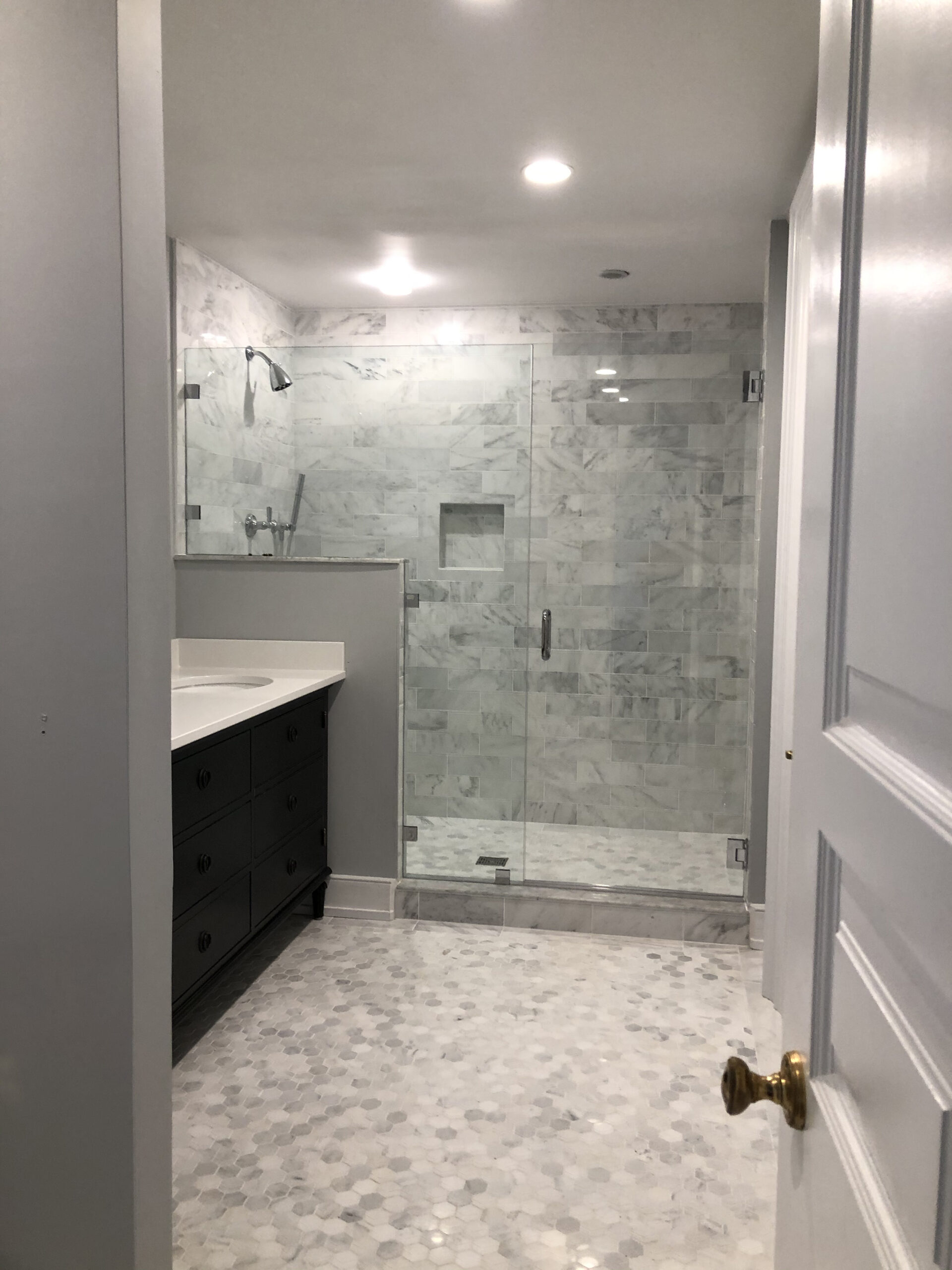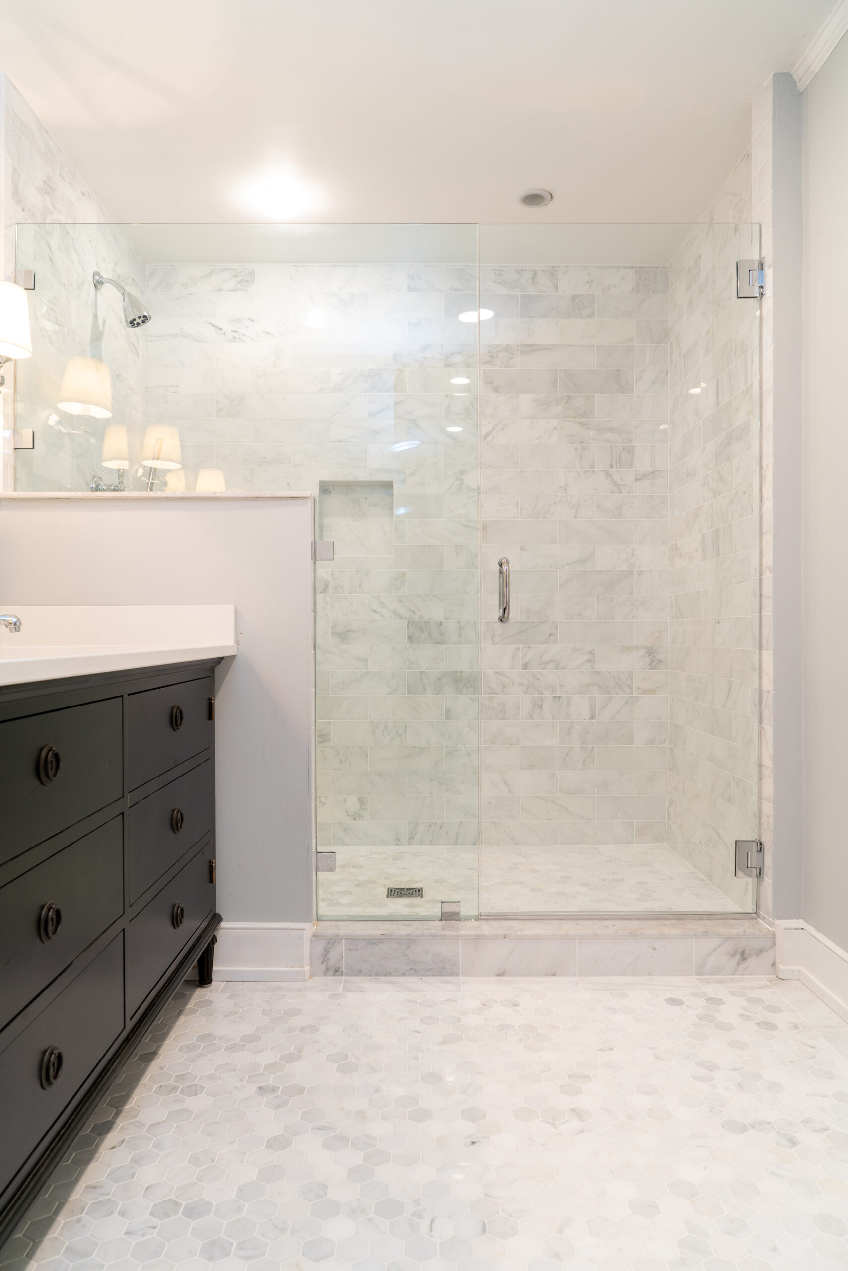 Bathroom design that seamlessly combines modern aesthetics with functionality. It features an elegant vanity cabinet, a glass shower enclosure for a spacious feel, an intricate floor pattern for character, and strategic lighting to brighten the room. The result is a visually appealing and practical space perfect for relaxation and personal care.