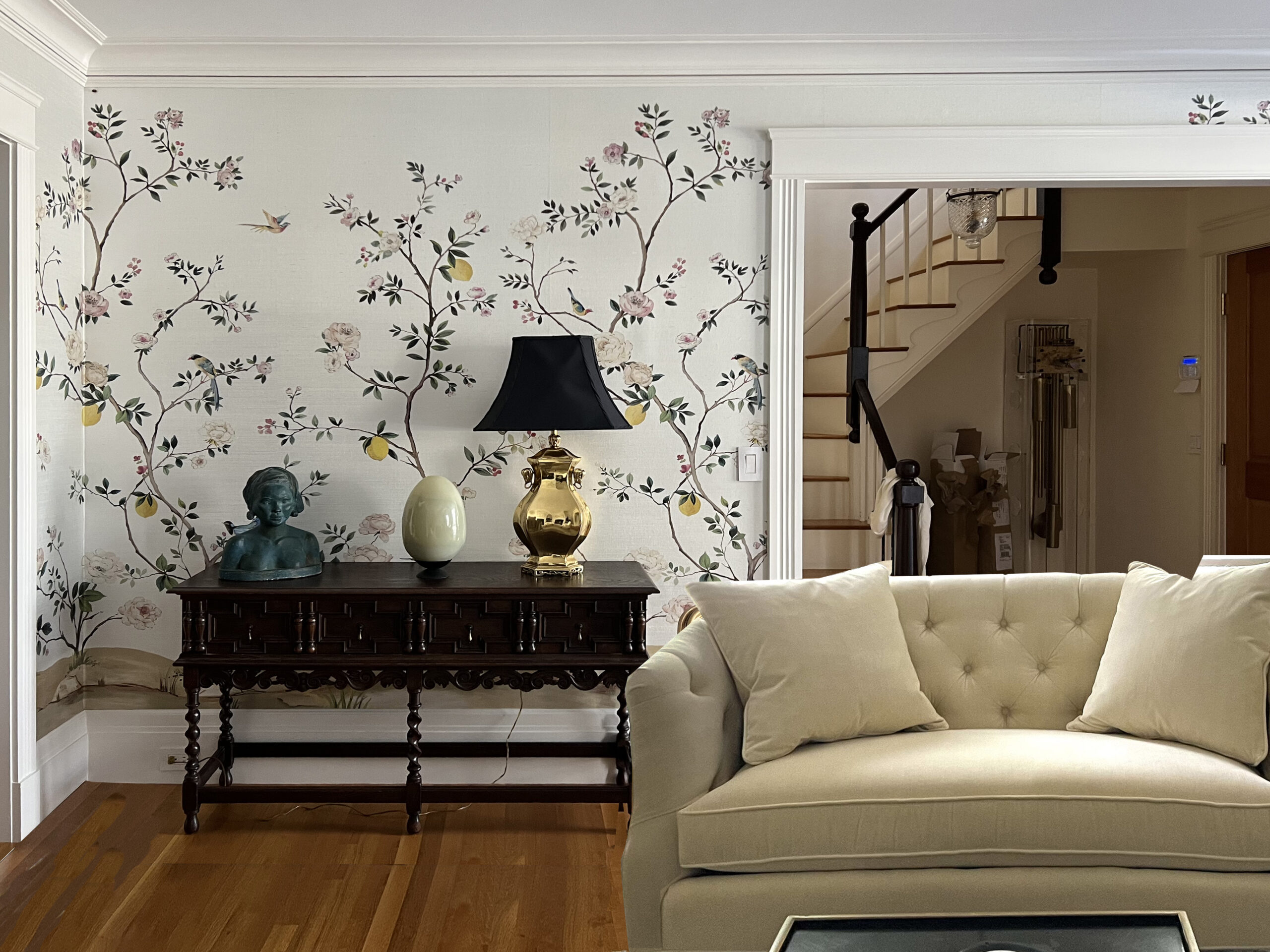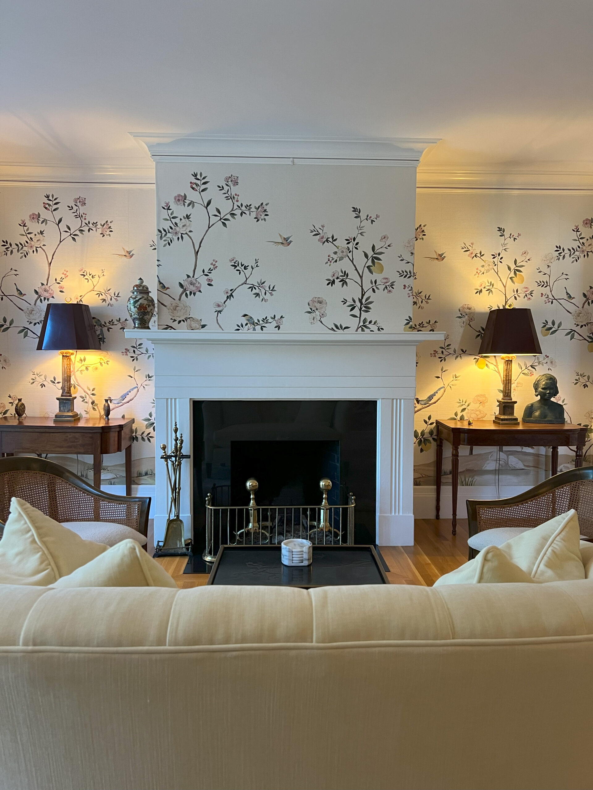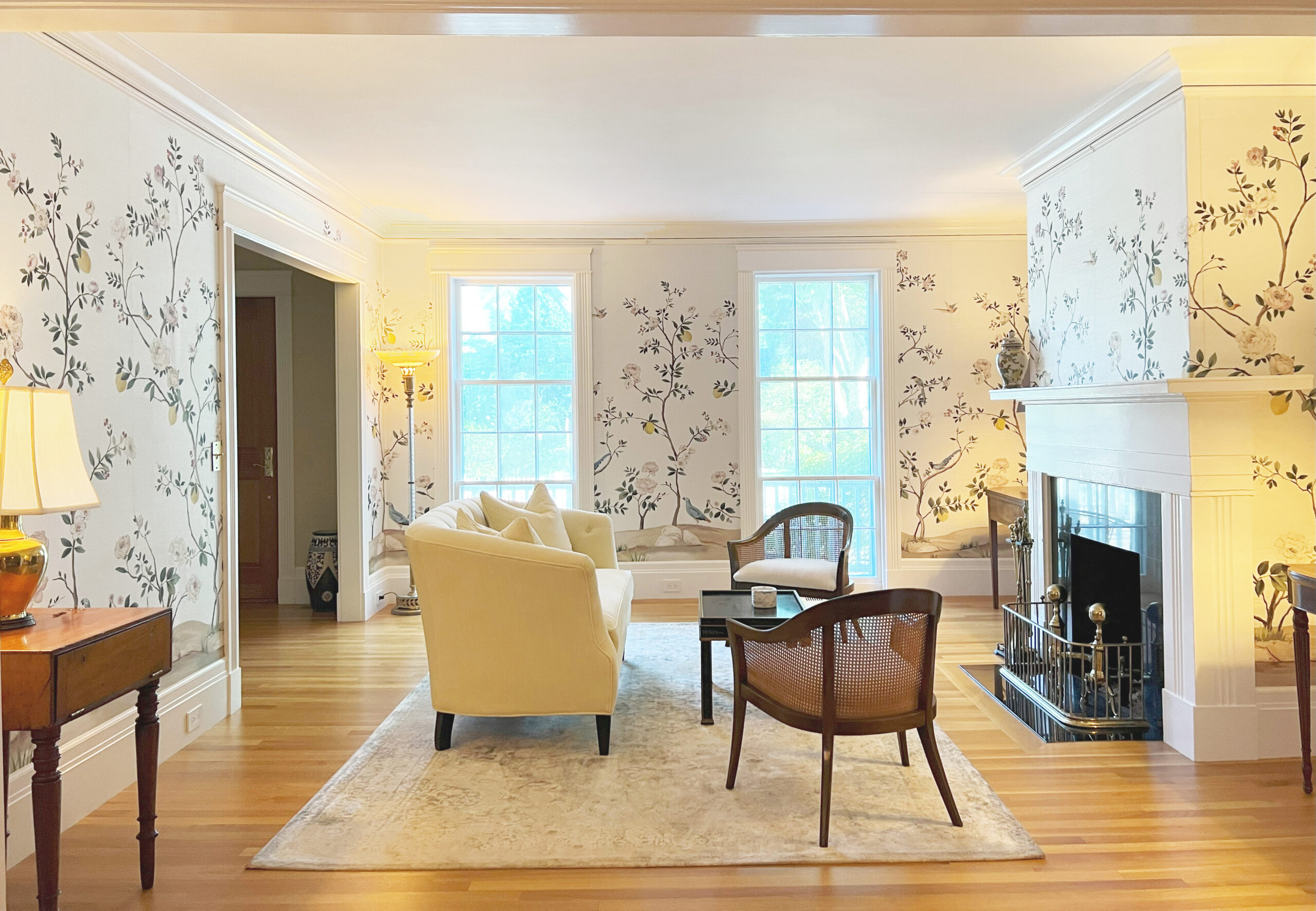 The family room’s interior design, focusing on creating a stylish and inviting atmosphere for families. Key features include a cozy fireplace for warmth and gatherings, elegant wooden flooring for a timeless look, and unique wallpaper for added character. The project will visually and descriptively highlight these elements to convey the room’s harmonious and comfortable ambiance.